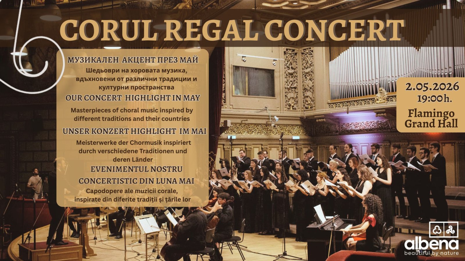 Магията на хоровата музика представя Кралския румънски хор в празничен концерт на 2 май от 19:00ч. в зала Гранд Хол на хотел Фламинго Гранд. Албена предлага на гости и ценители на хоровото изкуство уникално съчетание от вокално майсторство на красиви гласове и морска атмосфера.