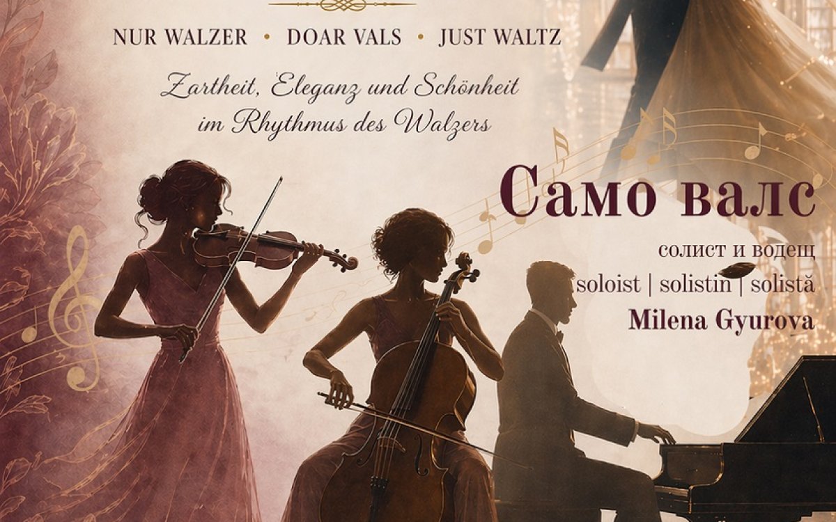 The waltzes are presented in their full emotional palette — ethereal, romantic, bravura, captivating, and sometimes melancholic — performed by Trio Divertimento: Graziella Panayotova (violin), Sofia Radilova (cello), and Mladen Taskov (piano). The soloist and host is soprano Milena Gyurova, who will guide the audience through this exquisite musical experience in both German and Bulgarian.