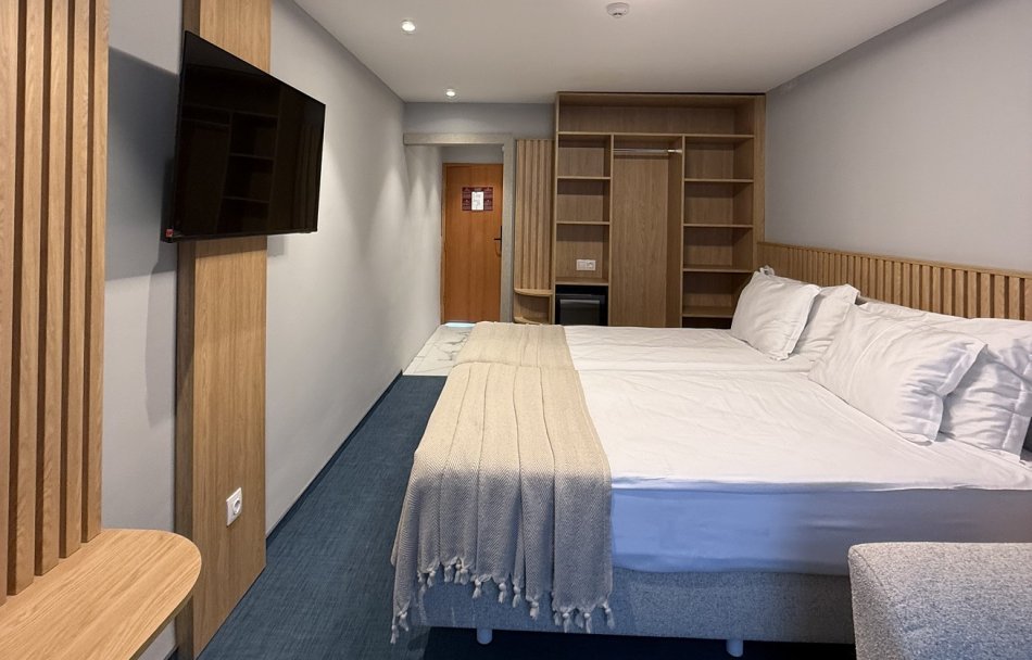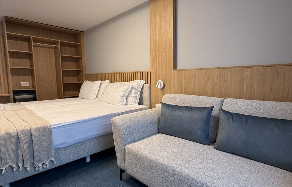Telefon și birou cu scaun. În aceste camere Duble cu pardoseală ai la dispoziție un balcon mobilat cu scaune și masă, perfect pentru relaxare după o zi de vacanță activă, privind natura care se cere descoperită. Suplimentar, camerele se pot conecta cu camera alăturată.